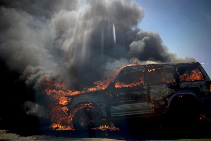 Photograph: A burning vehicle on the Lugansk-Krasnodon highway.