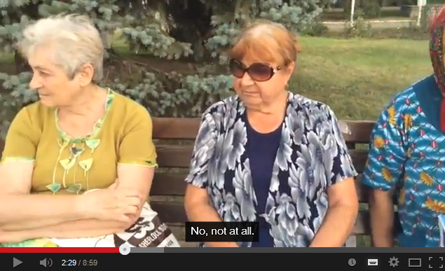 Pic11The sense of fear is palpable. The voluble woman in the blue top is particularly aware of the dangers of saying anything against the authorities – the ‘Russian Roulette’ episode shows her in the square when Simon Ostrovsky witnessed the denouncing of ‘separatists and terrorists’. There were also a lot of men around back then, and it’s hard not to wonder where they all are now.