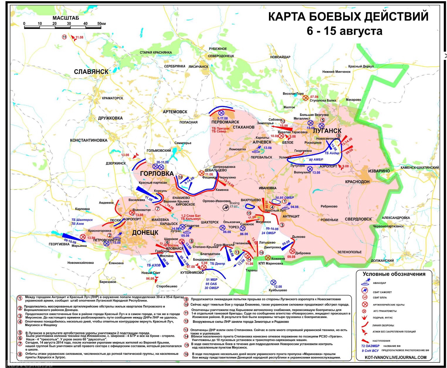 Kozhevnya has been taken. In the area of Miusinsk and Krasniy Luch, the units of the Ukrainian Armed Forces were partially eliminated and partially taken prisoner. There remain a few isolated pockets of resistance. Given that the DPR Army has commenced its assault, there is nowhere that they can expect help from, and that is why 17 soldiers of the 25th Brigade today crossed the border into the Russian Federation and the DPR Army has been reporting cases of mass surrender by the remaining servicemen of the 25th Brigade.