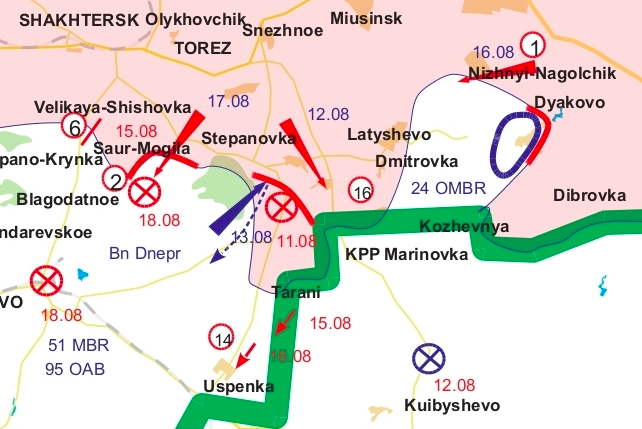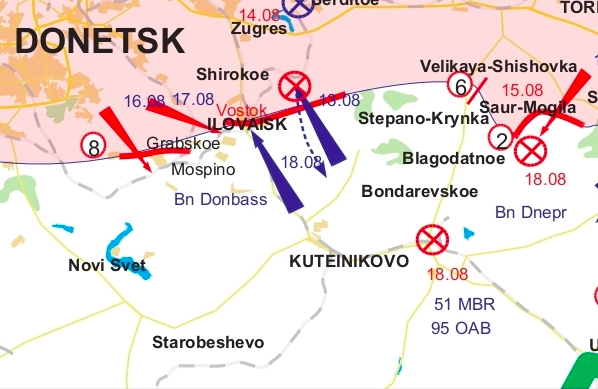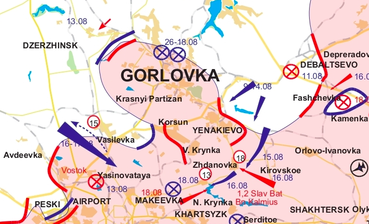 In general, the Militia at this time needs to drive the Junta out of Novosvetlovka, retain Yasinovataya, Ilovaisk and the corridor to Gorlovka, and also to knock the enemy out of Zhdanovka. At the same time, it will also need to find the troops to complete the liquidation of the two surrounded enemy brigades located to the south of Krasniy Luch.