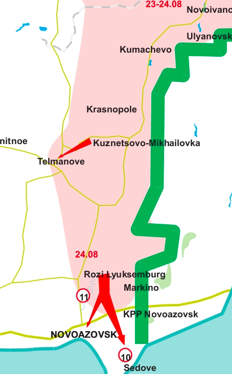 1. The situation has become precarious for the Junta in the area of Novoazovsk and Mariupol. The Militia forces that penetrated from the north, and also those that moved along the border with the Russian Federation, created an operational crisis in the area of Novoazovsk, which in itself implies a threat to Mariupol. The panic on the Junta-aligned websites is not without foundation. As we mentioned earlier, there are very few combat-capable units there – a hodgepodge of police, punitive troops, border guards and air defense personnel, clearly not the forces you can repel a serious Militia offensive with.