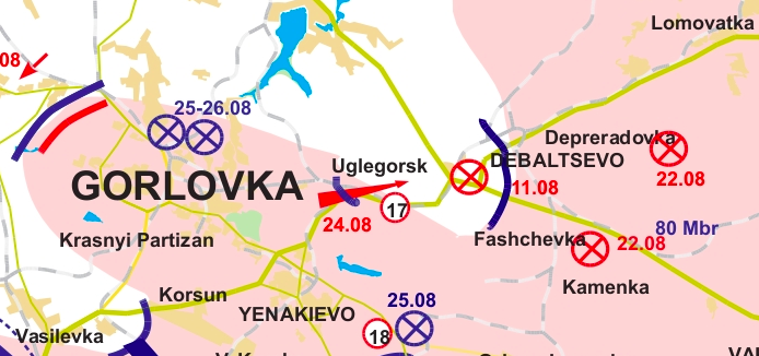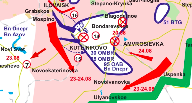 2. The gap in the front to the south of Amvrosievka, which the Junta recklessly didn’t plug for a few days, led to a disaster as expected. Not only did the Militia use the gap to advance to Uspenka and Novoazovsk and to create a threat for Mariupol. Also, the Junta units that were drawn into the battle for Ilovaysk have spent their reserves, which resulted in a Militia advance onto those Junta battle groups’ communications and the threat of attacking Militia units taking Amvrosievka. An encirclement of a kind emerged, which is already the 3rd encirclement in the south. Although this one is more of a partial encirclement – the Militia intercepted a number of important roads to the south of the main forces of the Junta battle group, but there’s no talk yet about a complete encirclement across all paths, because the Militia are actually encircling a larger force with a smaller one. In the next few days the Junta will try to break out of this critical encirclement, but if they fail to do this, then the first two southern cauldrons will be chump change compared to this one.