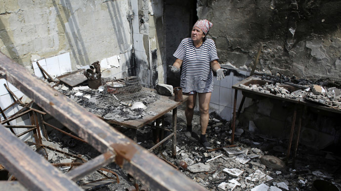 The next day the town was bombarded. The first mortar attack hit the area of the “Precision Machinery” factory and residential neighborhood adjacent to it. The factory had already been abandoned by this time. A shell landed on one of the shops, a fire started, and smoke was visible from any part of Donetsk. In the residential neighborhood, by a miracle, the only damage was flattened fences, torn power lines and an exploded gas-pipe. When our crew arrived at the scene, we found the people in a state of panic and confusion. Residents left without electricity spilled out into the street, cursing the war, “the Junta” and Poroshenko. They began to collect things… Somewhere in the distance could be heard the incessant volleys of artillery. It was not clear exactly what were the targets of the Ukrainian artillery. But looking at the damage to private houses, it became obvious that the war had came to this city; and the Ukrainian artillery fires regardless of whether there is any particular military target or not. After all, neither “Precision Machinery” nor the village housed any military targets and the Militia was not present…