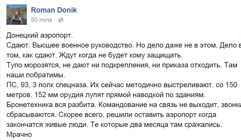 The Donetsk Airport. They are surrendering. The top military brass. But that, in itself, is not the biggest problem. The problem is in how they are going about it. They are waiting until there is nobody to defend it. They are simply stonewalling; they are not providing reinforcements or giving an order to retreat. Our sworn brothers are there. The Praviy Sector Corps, the 3rd Spetsnaz Regiment. They are being methodically shelled from 150 metres away. 152 mm artillery shells are being lobbed point blank at the buildings. All the armoured vehicles have been destroyed. The command is incommunicado; the calls are being dropped. Most likely, they have decided to leave the airport garrison to its own devices until there is nobody left. Those who fought there for two months. Bleak.