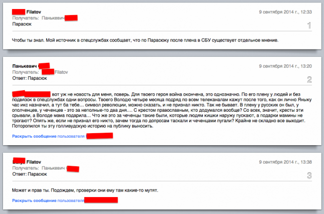 Now let us move to the content analysis of the emails. The dialog begins with suspicions regarding Parasyuk—a notorious Euromaidan activist and a commander of the 4th company of “Dnepr” battalion. He was captured at the beginning of September, but he managed to escape and rejoin his comrades in arms.