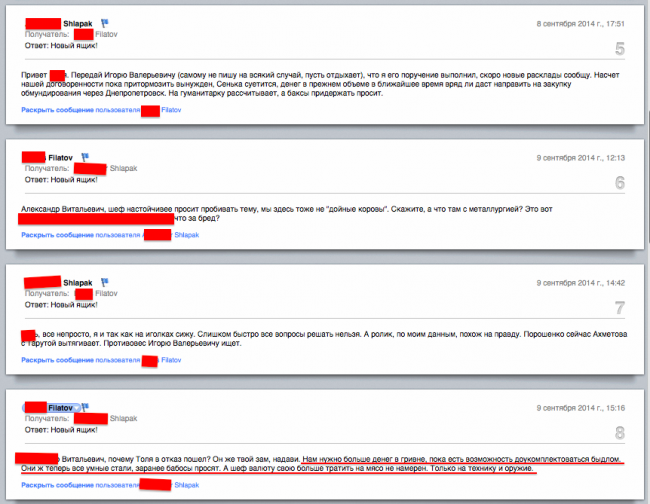 I came into possession of the correspondence archive of a certain person named B. Filatov. I have no idea whether it is a coincidence or not, but a person with a very similar name currently holds the position of Chief Executive of Dnipropetrovsk Regional State Administration, and according to some reports, he happens to be a very close friend of Kolomoysky. The link to the dossier in Russian http://politrada.com/dossier/persone/id/9527.html