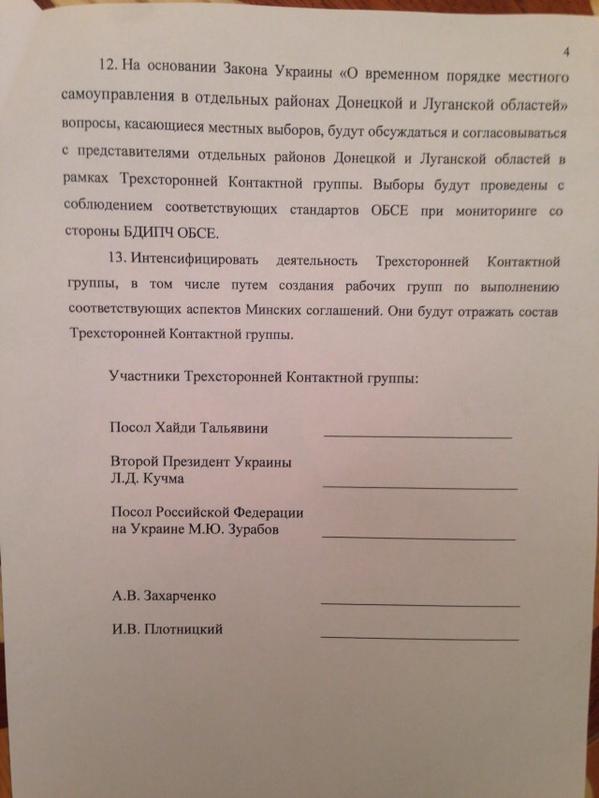 Posted by kpomeroy | Feb 12, 2015, 13:31This is the final Minsk Agreement (February 12, 2015) as proposed by the Normandy Four and executed by Zakharchenko, Plotnitskiy, Kuchma (Ukraine), Zurabov (Russia), and Taglivini (OSCE) on February 12, 2014. It is not the suggested format of the agreement, but, instead, the final version thereof.