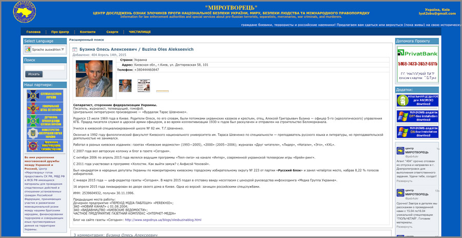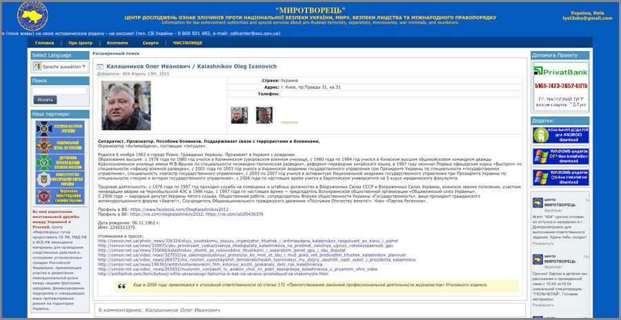 The Ukrainian website “Mirotvorets” [The Peacekeeper] publishes personal information of “separatists”, “partisans of the Russian Universe” and other enemies of the Kiev regime. On April 13, 2015, a user named “404” published on this website all personal information on Oleg Kalashnikov: