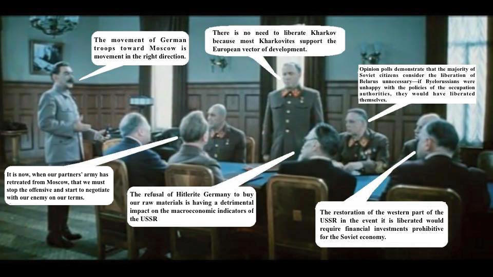 Preamble: This acerbic parody draws inspiration from the statements of various public figures in both Russia and Novorossiya, many of them self-styled advocates of the Kremlin’s point of view and proponents of Minsk negotiations and the various painfully ridiculous geopolitical stratagems that have been collectively designated as the “cunning plan.” Many of the quotations from statements made by these opportunists are used almost verbatim, with appropriate substitutions, where necessary, of Germany for Ukraine, Ostland Reichskomissariat for the DPR and the LPR, and so forth. Understanding how preposterous statements like these would have sounded coming from the victors of the Great Patriotic War, the people who defeated the scourge of fascism in Europe, should jolt many into understanding some of the troubling aspects of the passive Russian policies in relation to the war in Ukraine and the failure of the government to explain its motivations.