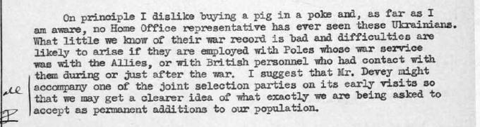 difficult to understand the Ministry of Labour attitude over these POWs. To strain at the gnat of the PLF while appearing to be prepared to face with equanimity the prospect of swallowing a large-sized camel in the shape of upwards of 4,000 undisputed volunteers of the Wehrmacht seems to me the height of absurdity…I cannot help having serious misgivings about their attempt to foist the Ukrainian POWs on the labour market as just another batch of EVWs. [European Volunteer Workers].